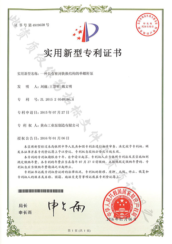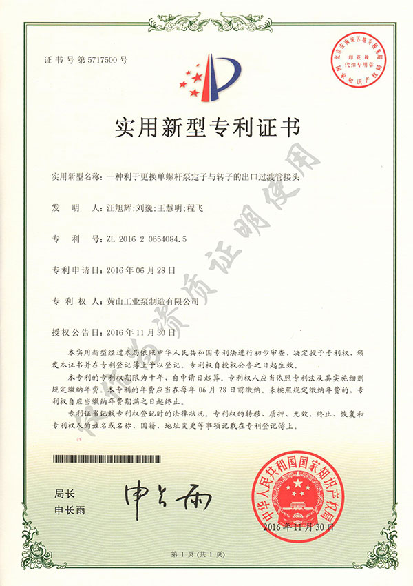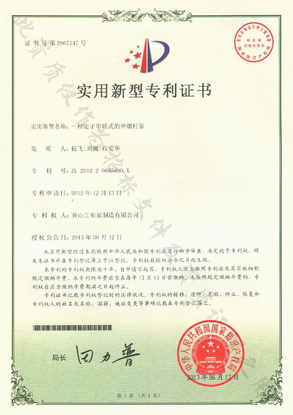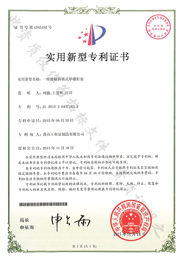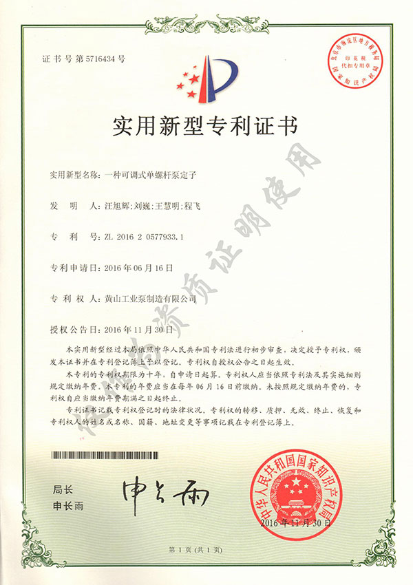 388vip太陽集團尊重知識產權,重視技術儲備及產品研發,目前黃山388vip太陽集團單螺桿泵有限公司擁有1項發明專利,10項實用新型專利